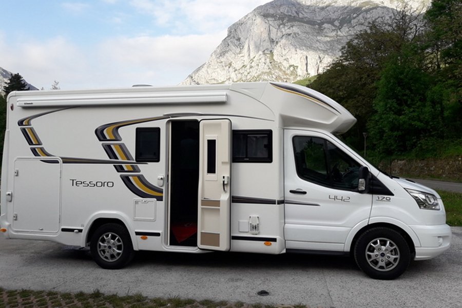 Polointegrovaný obytný automobil Benimar Tessoro 442/FORD 2.0 TDCi (170HP) pro pět osob (4 dospělí + 1 dítě) . Vůz je vybaven motorovou klimatizací, markýzou, TV+DVBT2, velkou garáží a nosičem na čtyři kola. Ideální obytné auto pro cestovatele, kteří si chtějí užít maximální pohodlí na rodinné dovolené.